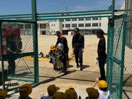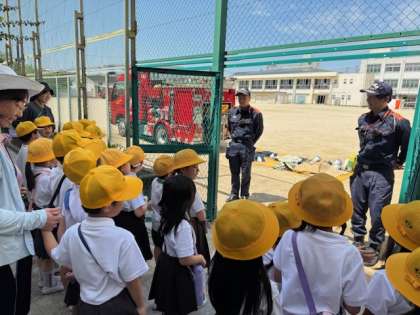 1、2年生は消防車見学、防災ビデオ視聴、防災クイズに取り組みました。
