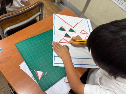 カッターナイフで切り抜く作業などをしていました。これから色セロファンを貼り付けてステンドグラス風に仕上げていくようです。