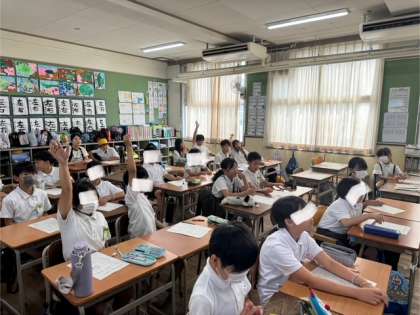 今日は2組で栄養指導を行いました。たくさん手を挙げて発表していました。