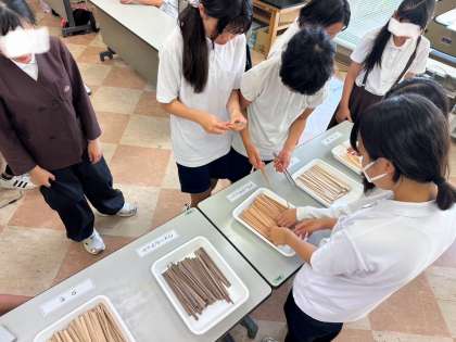 木工では、お気に入りの材木を選んでお箸づくりをします。選んだ後は、ヤスリで磨いていきます。