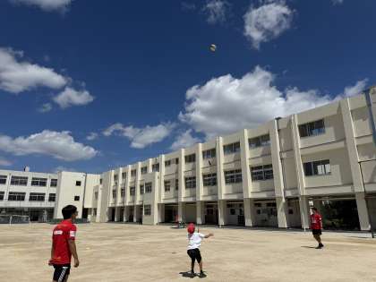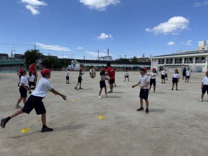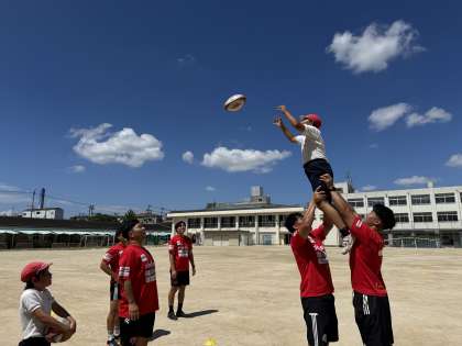 体ほぐしの後、パス回しやラインアウトのボールキャッチ、パントキックのキャッチなどにチャレンジしていました。