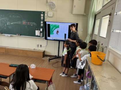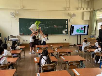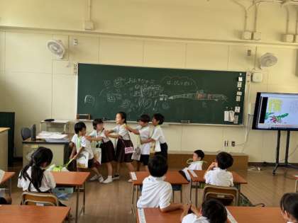 国語科の読み物教材「おおきなかぶ」を使って、発表会をしました。デジタル教科書の自動音声に合わせて、動作化による表現活動でした。