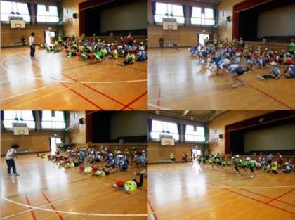 上の写真は、腹ばいになった姿勢から素早く立ち上がり、ゴールまでダッシュする運動に取り組んでいる様子です。