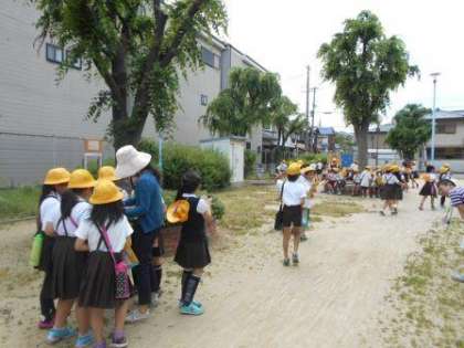 学校を出発して、郵便局→瓜破神社→区民わた畑を通って瓜破第一公園で休憩し、簡単なまとめをしました。