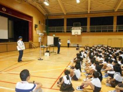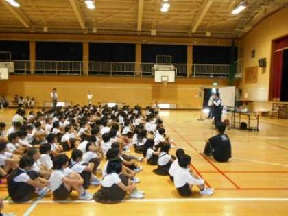 2時間目、平野警察署交通課の方にお越しいただき、1〜3年生が道路の安全な歩行について学習しました。