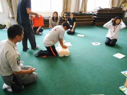 午後からは、平野消防署の方々に来ていただき、教職員と、参加を希望された保護者のみなさんとが、救急救命講習を受けました。
