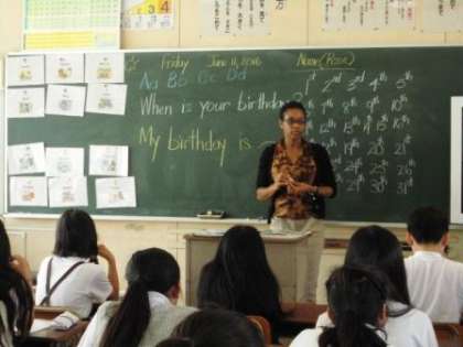 写真は、6年生が、ローズ先生に、誕生日のたずねかたと答え方を教わっている様子です。