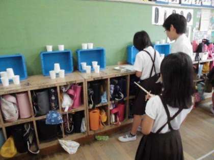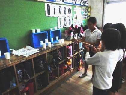 紙コップの的をわりばし鉄砲で撃ち、得点をきそいます。
