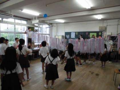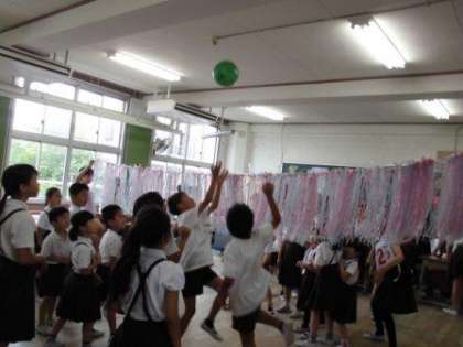 ふわふわ動く風船を、2つの班で真剣に打ち合っていました。