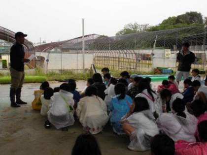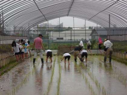 6月29日(水)の午後、5年生は、大阪市農協営農センターのみなさんに教えていただいて、田植え体験をしました。