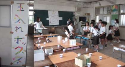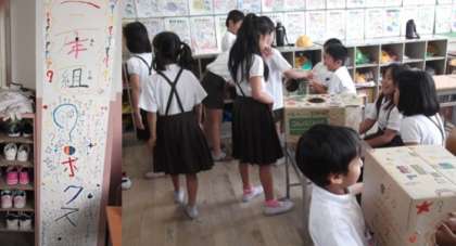 3年2組のお店は、箱やヨーグルトのカップにピンポン玉をできるだけたくさん入れることにチャレンジする『玉入れボックス』です。