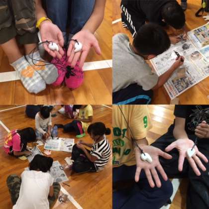削るのに時間がかかり苦労しましたが、紐を通して立派に出来上がりました。互いに見せ合ったりして、みんなは、とても喜んでいました。