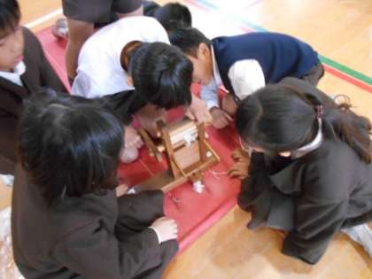初めに、綿繰り機、綿弓、糸車など、道具の名前と使い方について教わりました。その後、実際に道具を使う体験をさせていただきました。何もかも手作業で行わなければならなかった頃の、昔の人の苦労について、めったにできない体験を通して考えることができました。