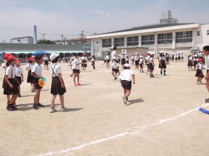 今年の競技は長縄とびです。1年生から6年生が混じった縦割り班で競技を行います。低学年は大波小波で、高学年は八の字とびで、3分間で何回とべたかを競います。