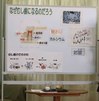 測定前の保健指導では、6月の保健目標「歯を大切にしよう」に合わせて、むし歯の予防について学習しました。