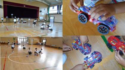 学習内容を活かして「電動カー」を作り、体育館で走らせました。