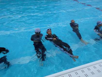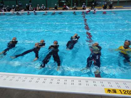 もし、衣服のまま水中に落ちた時は、あおむけの姿勢で浮き、救助を待つことが大事です。その点をしっかりと確認し、実際に水に入りました。