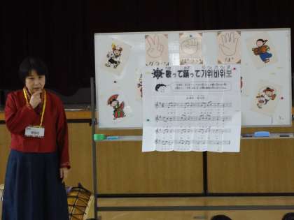 金景姫(キムギョンヒ)ソンセンニㇺに講師をお願いして、韓国・朝鮮のあいさつや、遊び、歌・楽器などを教えていただきました。