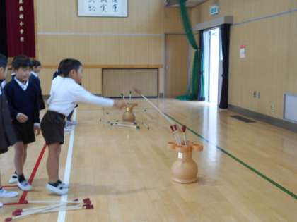 写真は、3年生のチャンゴ演奏の体験と、1年生のトゥホの遊びの様子です。