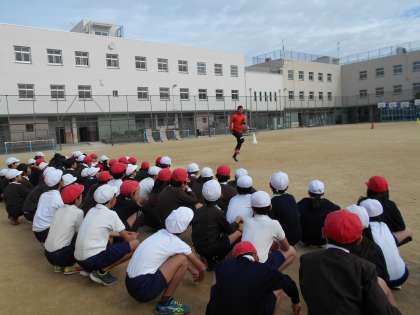 陸上選手の荒川大輔さんに来ていただいて、ご講演と実技指導をしていただきました。