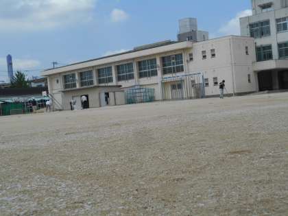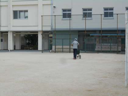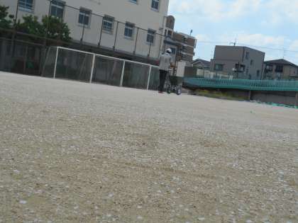 運動場に「にがり」をまきました。