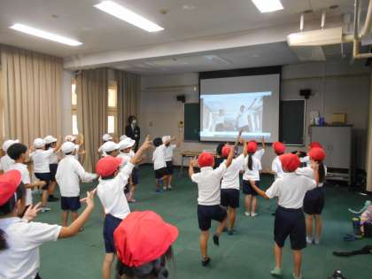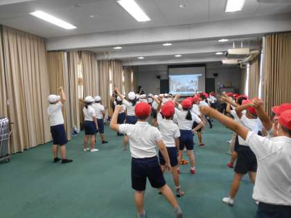 運動会のダンス(表現運動)の練習が始まりました。まだ暑いので、多目的室でビデオを見ながら動きを覚えはじめたところです。大きな声も出して元気に取り組んでいました。