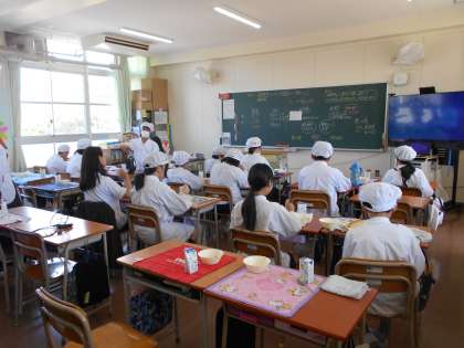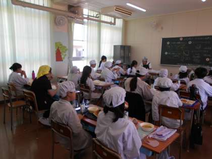 6年生の給食の様子です。6年1組では今日から教育実習の先生が来て先生になるために勉強しています。給食の時間、みんなと一緒に食べました。
