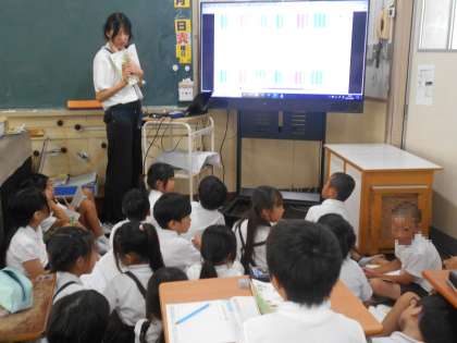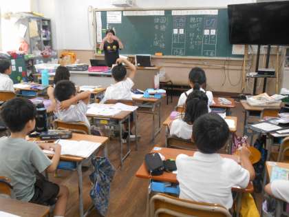 1組は大型テレビの前でお話を聞いています。2組は、漢字学習をしているところでした。