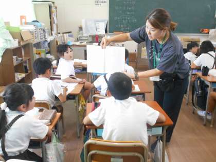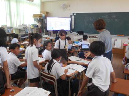 ノートの書き方が上手なお友だちのノートを、みんなで見て賞賛しているところです。
