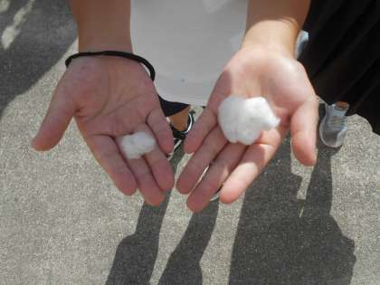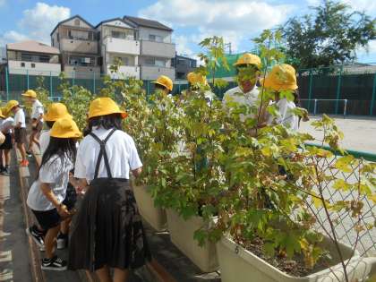 わたの学習に取り組んでいます。夏休みにも先生方が水やりしたり実をとったりして育ててくれていました。今日は、自分たちが育てたわたを観察し、実をとる体験をしました。