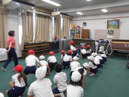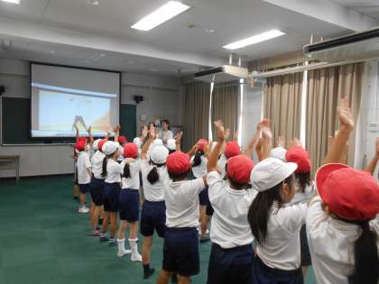 運動会に向けてのダンスの練習が始まっています。多目的室で、動画を見ながら動きを覚えていました。
