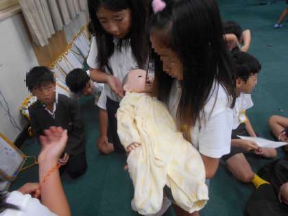 今日は座学以外にも、赤ちゃん模型をつかった抱き方体験、妊婦ジャケットを着用した妊婦体験、そして実際の赤ちゃんとお母さんとのふれあい体験をしました。