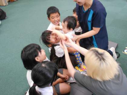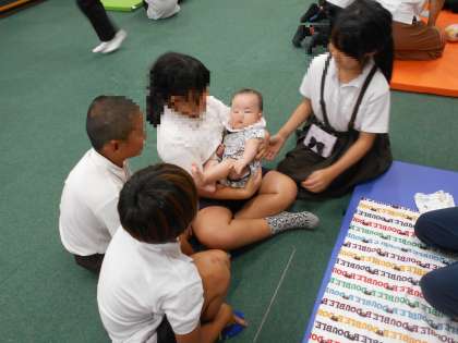 赤ちゃんとふれあっていると、ふれあっている子も、まわりの子も自然と笑顔になっていました。赤ちゃんの力ってすごいなあ、と改めて感じました。