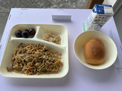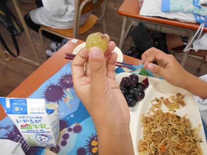 今日のぶどう(巨峰)は、長野県産です。大粒で甘いのが特徴の巨峰、上手に皮をむいて食べていました。