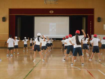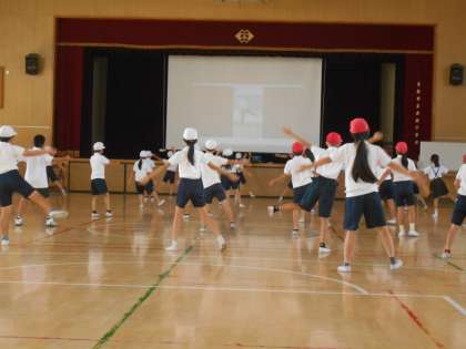 体育館でダンスの練習をしました。まだ練習を始めたばかりなので、映像を見ながらの練習です。