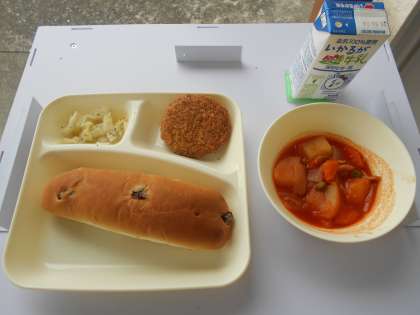 ケチャップ煮は、じゃがいもやニンジンなどの根菜やお肉、グリーンピースなど具材が豊富で彩りもよかったです。