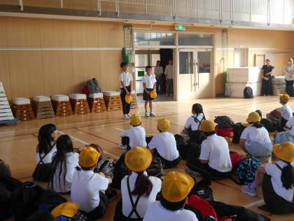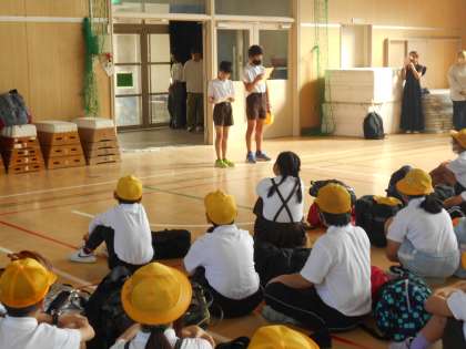 バスに乗る前、体育館で出発式を行いました。代表児童が楽しみにしているキャンプファイヤーなどの行事について発表しました。