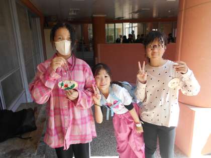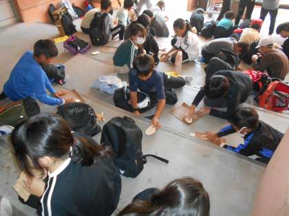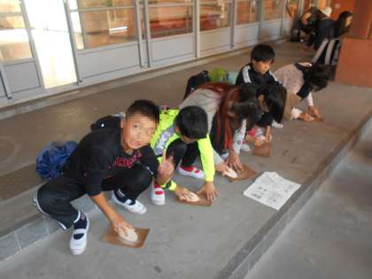 昼食の後にスライスチップの製作をしました。配られた板をきれいに磨いてから、絵をかいたり文字をかいたりします。きれいに磨けている子は、板の表面がつるつるして滑らかに仕上げていました。いいお土産ができましたね。