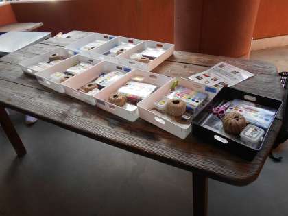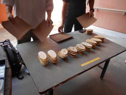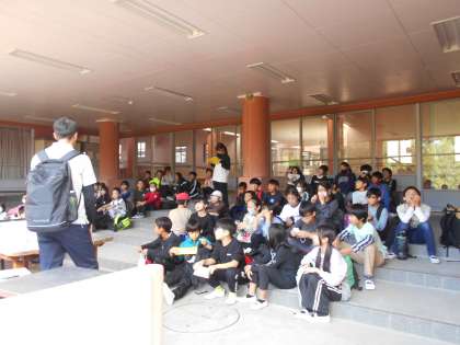1日目の最初の活動「スライスチップづくり」の様子です。説明を受け、用具を受け取りました。