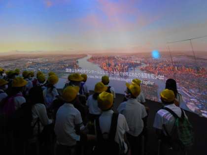 「人類は団結したときに最も強くなる(United for a Better future)」をテーマに、30以上の国連機関が一致団結して出展するパビリオンです。国連創設80年の歴史をたどる「タイムライン・ウォール」、国連と私たちのつながりを感じられる「オーブ(球体)の部屋」、持続可能な未来を体感できる「イマーシブ・シアター」の展示などがありました。