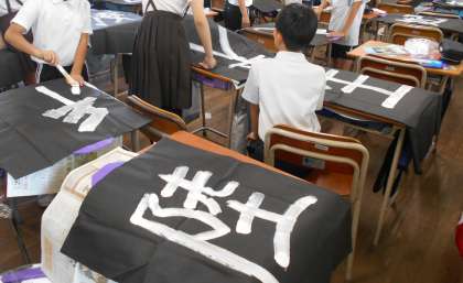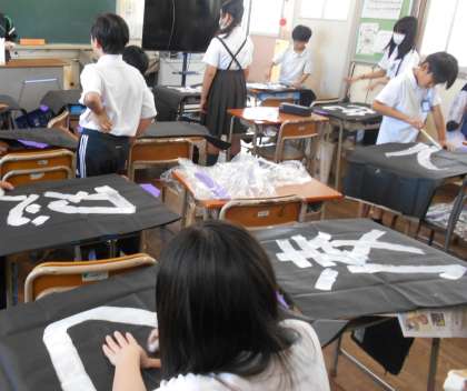 法被に好きな漢字を書いているところでした。なかなかの出来栄えです。お楽しみに!!