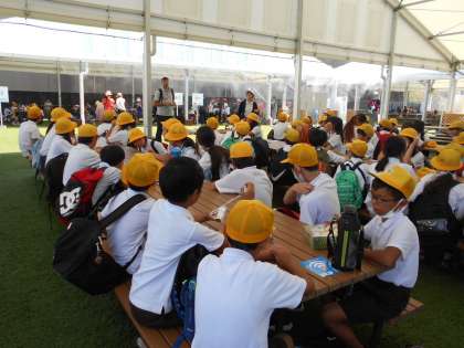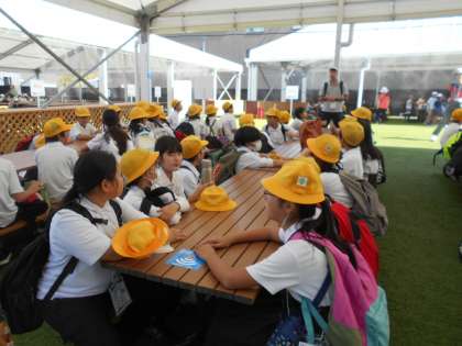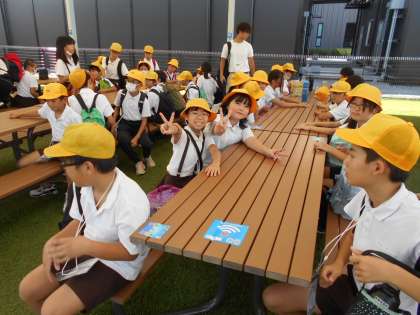 5年生は、団体休憩所で昼食をとりました。屋根からミストが出ていて涼しげでした。