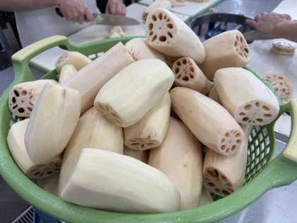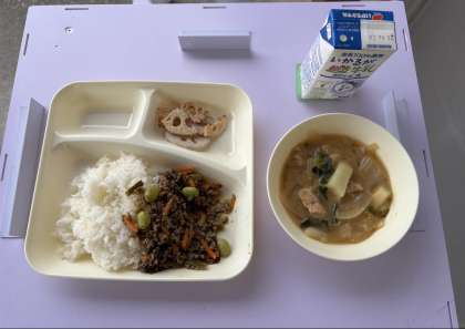 もずくと豚ひき肉のジューシーは沖縄県の郷土料理です。甘辛く煮込まれたもずく、豚ひき肉などの餡がごはんによくあって食がすすみます。焼きれんこんは歯応えがよく、美味しく頂きました。