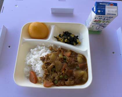 いつでもカレーライスは人気メニューです。デザートの黄桃も甘くて美味しかったです。明日は運動会、しっかり食べて元気に頑張ります。