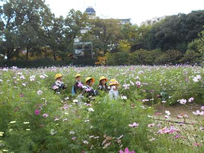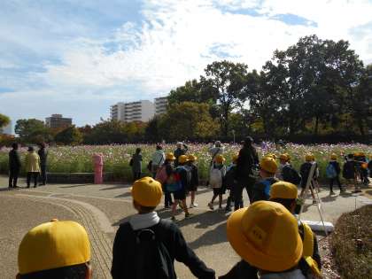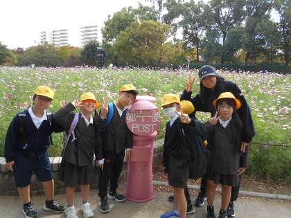 植物園に戻りました。コスモス畑の様子です。ピンクのポストもありました。