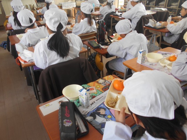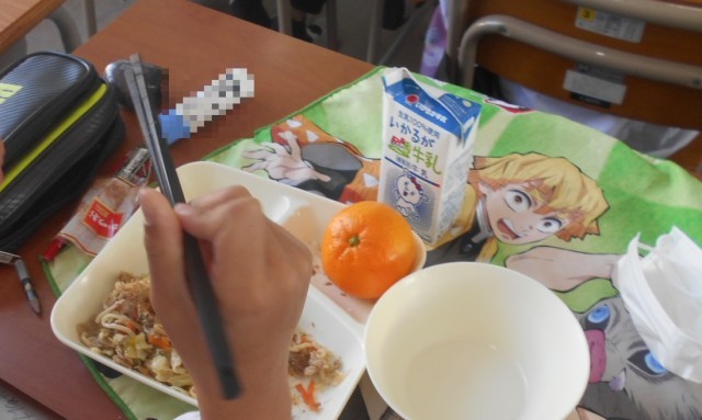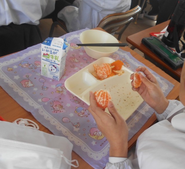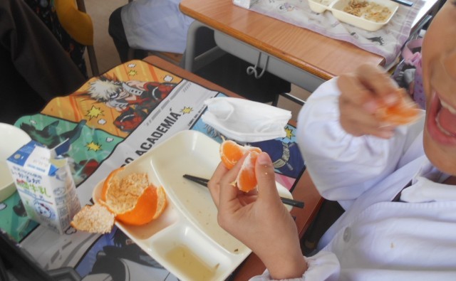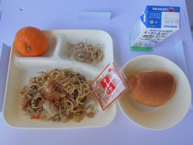 和風焼きそばは、あっさりとして食べやすいです。かつおぶしをかけると和の風味が高まります。今日のみかんは、佐賀県産です。とっても甘かったです。
