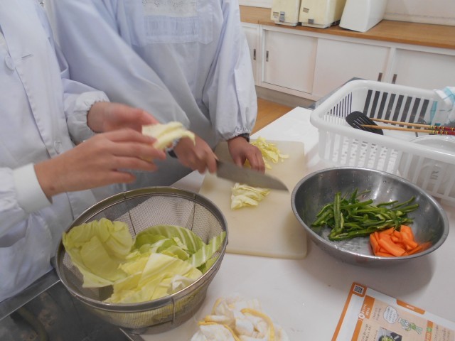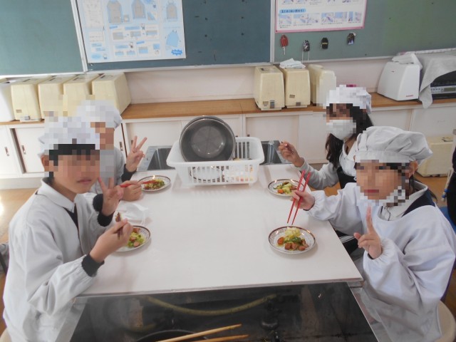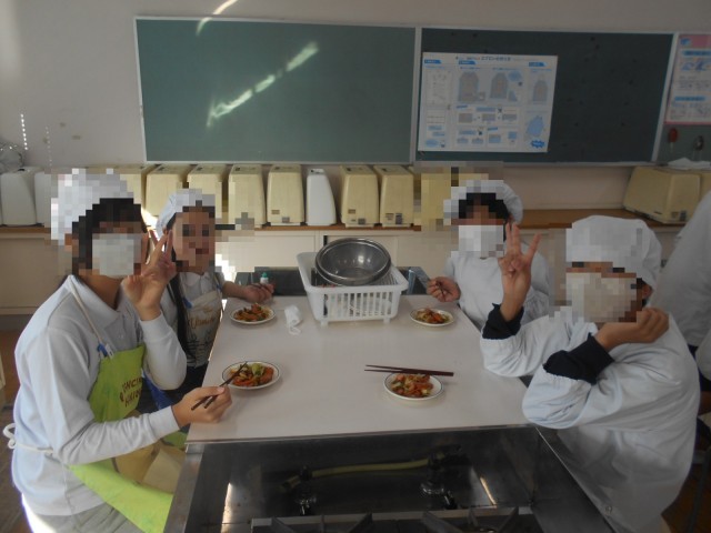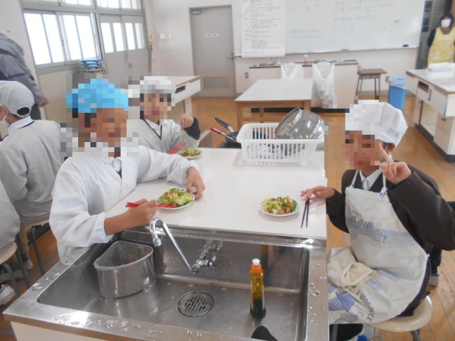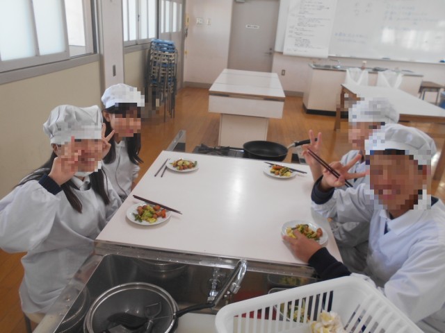 午後からは、1組の実習でした。チームワークよく、調理し、試食、後片付けまで協力して行っていました。