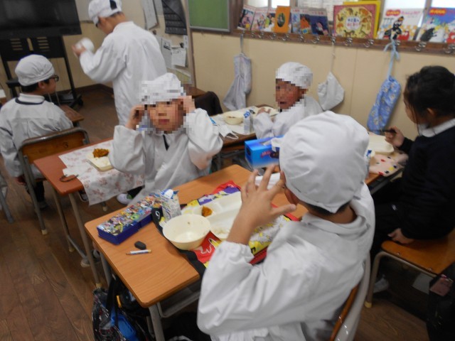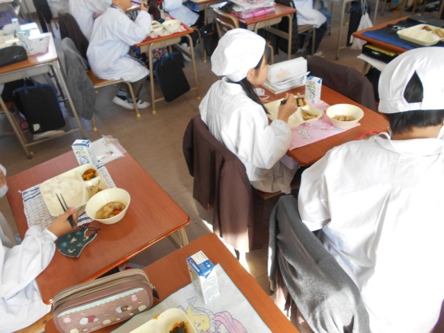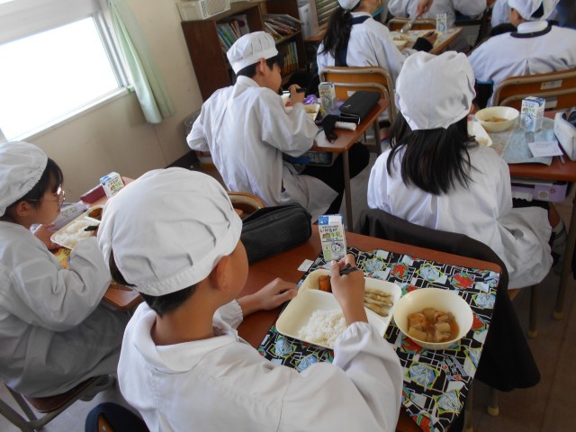 2年生は、今日の栄養指導「よく噛んで食べよう」を意識しながら食べていました。こめかみの動きを確かめながら・・・もぐもぐ・・・。