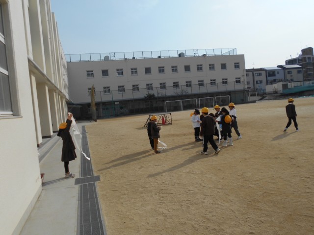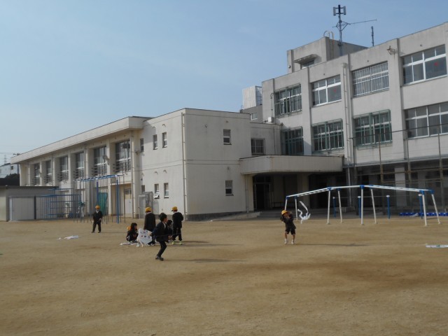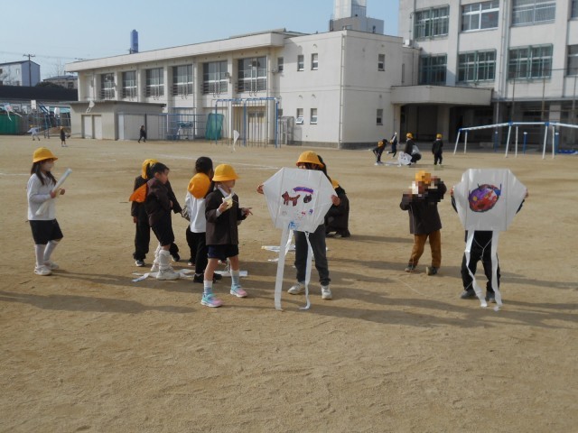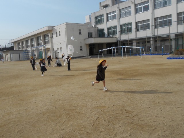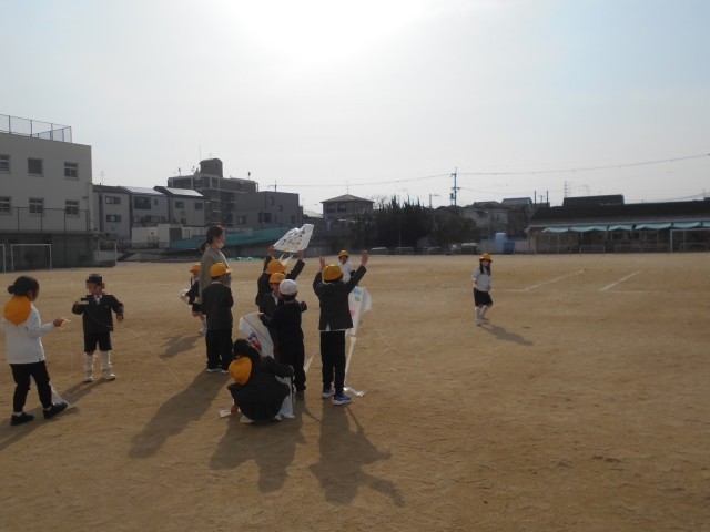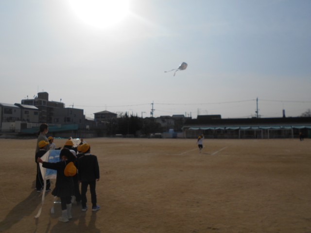 良い天気の元、たこあげをしました。今日は風があまりふいていなかったので揚がりにくかったかもしれません。しかし、楽しそうに運動場を走り回って遊ぶことができました。