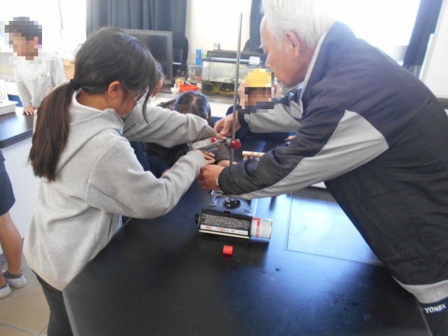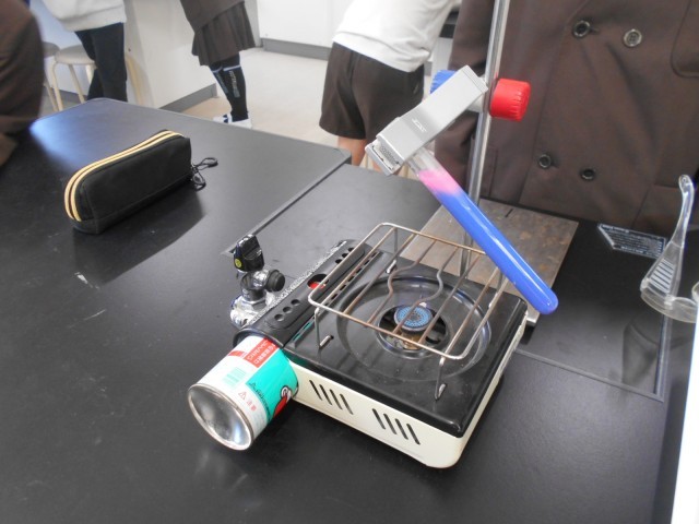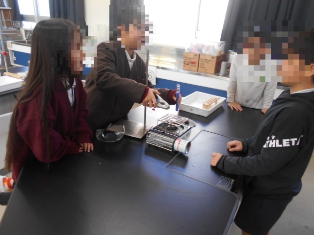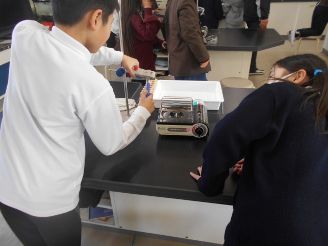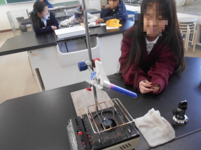 水を温めた時の温度の変化の仕方について実験しました。試験管に入れた水の上の方と底の方をそれぞれ温めた時を比較して、違いを調べます。今日は、上の方を温めた時の変化を確認しました。